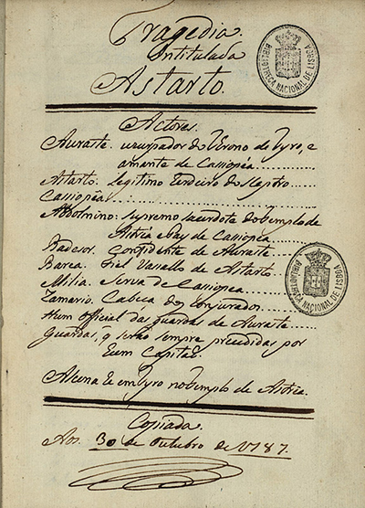 [3] The titles still in preparation are: O Criado Astucioso [The Witty Servant] (1781); Semiramis em Babilónia [Semiramis in Babylon] (1784), by Alexandre António de Lima; Licasto e Mitilene [Licasto and Mitilene] (1786); O Tartufo Lusitano e a Mulher Vingativa ou O Disfarçado Hipócrita [The Lusitan Tartuffe and the Revengeous Woman or The Hypocrite Disguised] (1796); Muito vence amor e engano ou O Ignorante por Sábio Admitido [Love and hoax win a lot or The Ignorant Taken for a Wise Man] (1796); Os Encantos de Medeia, 3ª parte [The Enchantments of Medea, 3rd part] (n.d.), by António José da Silva; Sem Ingratidão Ingrato [The Ungrateful Without Ungratefulness] (n.d.).